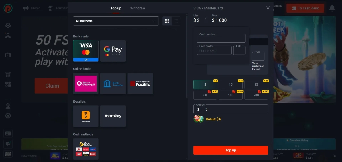 Step 3: Make Your First Deposit Head to the cashier section and select your preferred payment method. PIN-UP accepts multiple options including cards, e-wallets, and cryptocurrency. Enter your deposit amount and confirm the transaction.