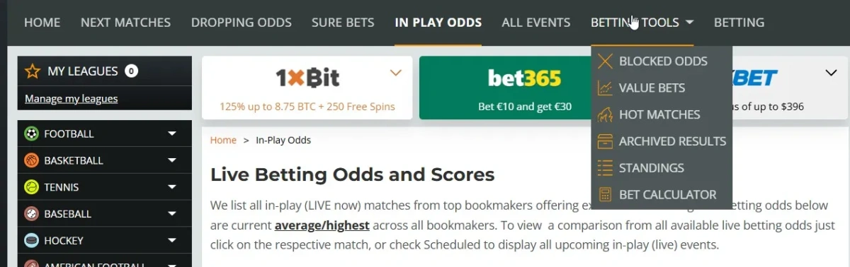 OddsPortal provides live betting odds for matches in progress, combined with real-time score updates. This allows bettors to: