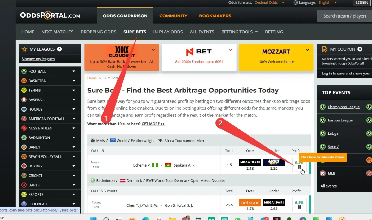 The sure bets calculator is a powerful tool for identifying arbitrage opportunities where you can guarantee profit regardless of the outcome. Here's how it works: