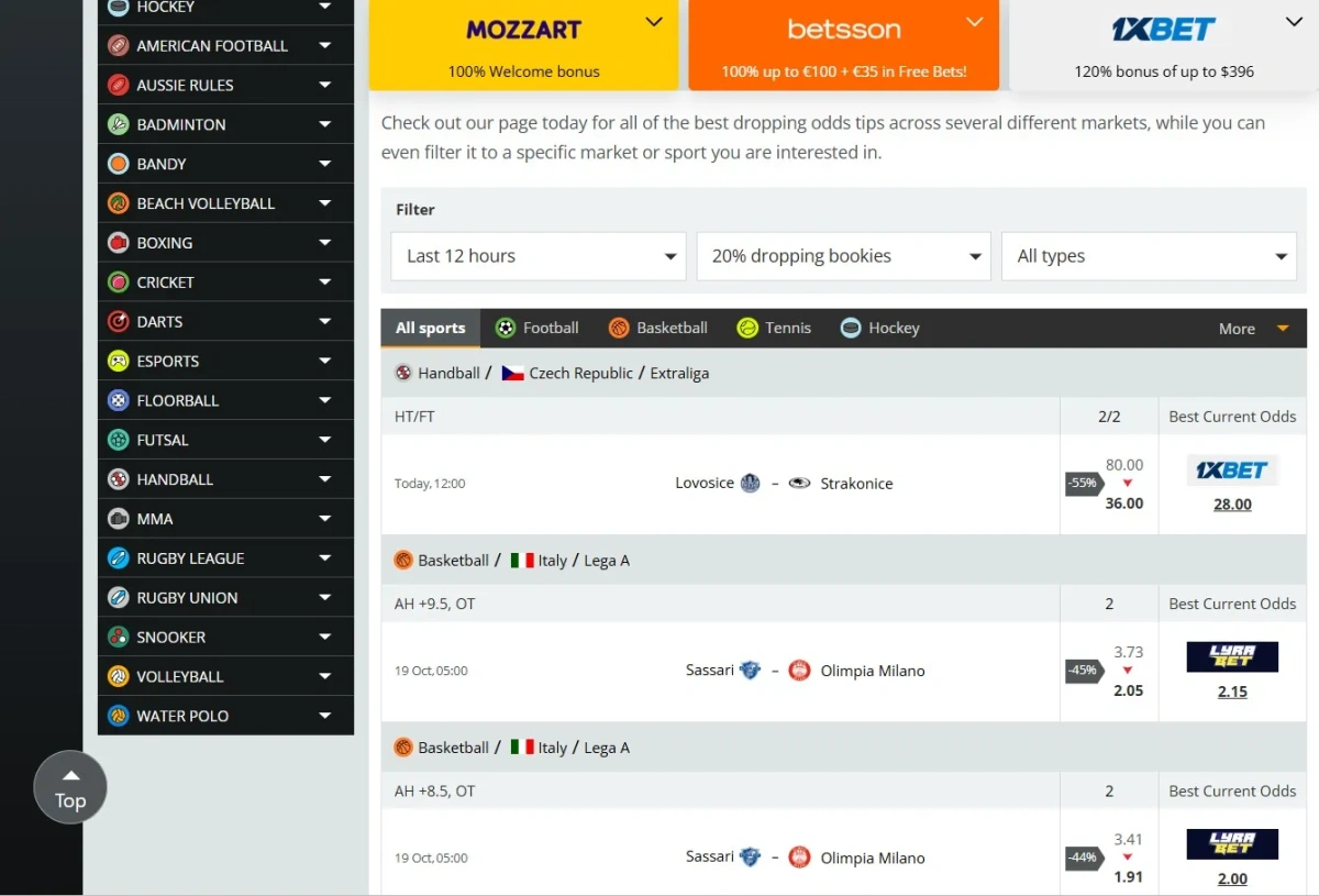 The dropping odds feature is one of OddsPortal's most valuable betting tools. It identifies when odds for a particular outcome have significantly decreased across bookmakers, which often indicates insider information or heavy betting action from sharp bettors.